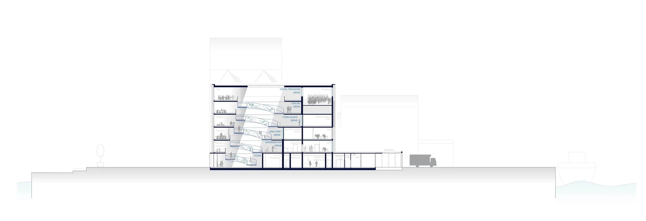 Das Gebäude gliedert sich in zwei klar definierte Hauptbereiche: Forschung und Öffentlichkeit. Beide Bereiche sind räumlich und funktional voneinander getrennt, treten jedoch über gezielte Einblicke und Überschneidungen in einen inhaltlichen Dialog. Die Forschungsbereiche orientieren sich zur Stadt hin und sind zugleich präsent am Hafen sichtbar, wodurch die enge Beziehung zwischen wissenschaftlicher Arbeit, maritimem Kontext und urbanem Raum betont wird.
