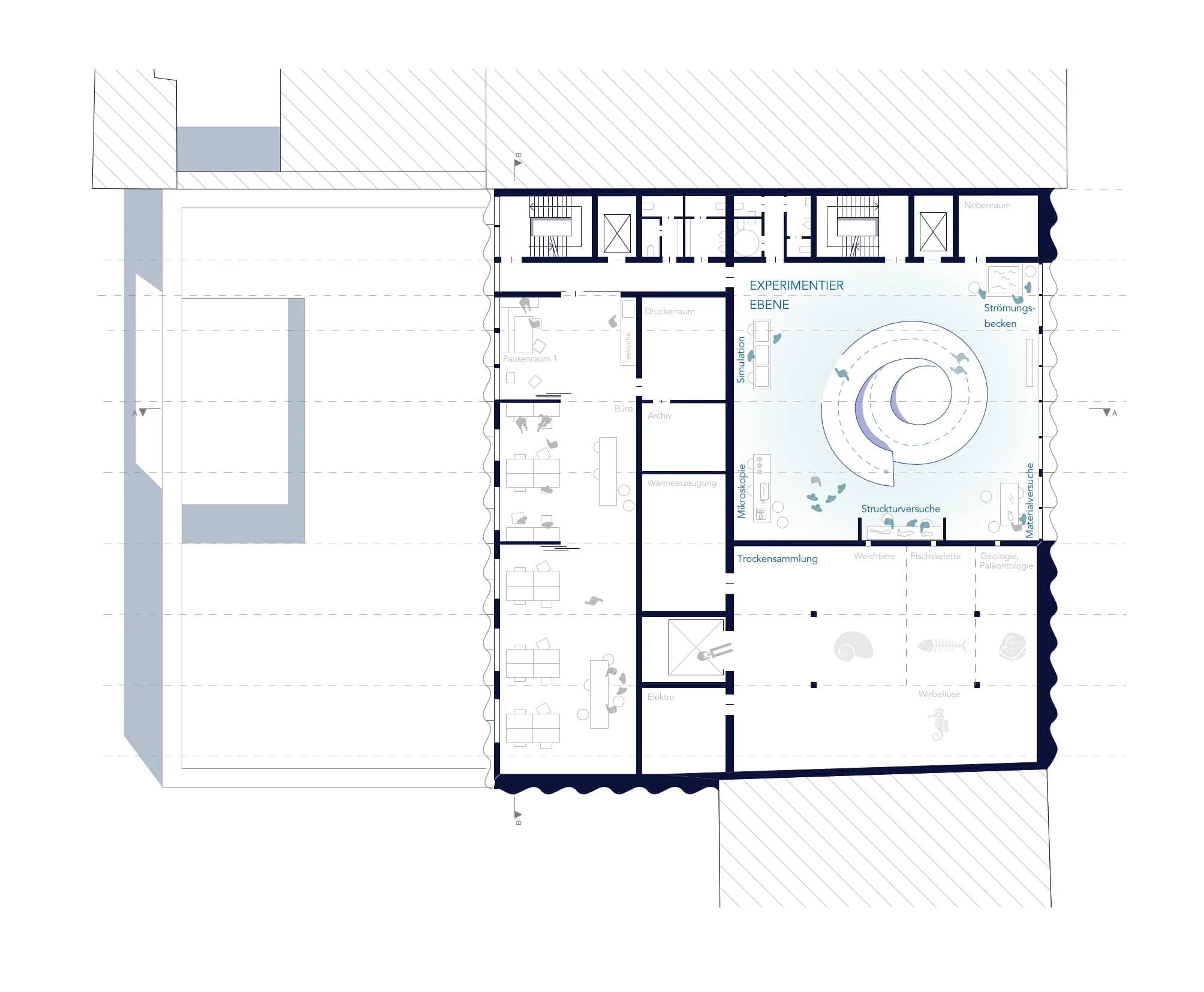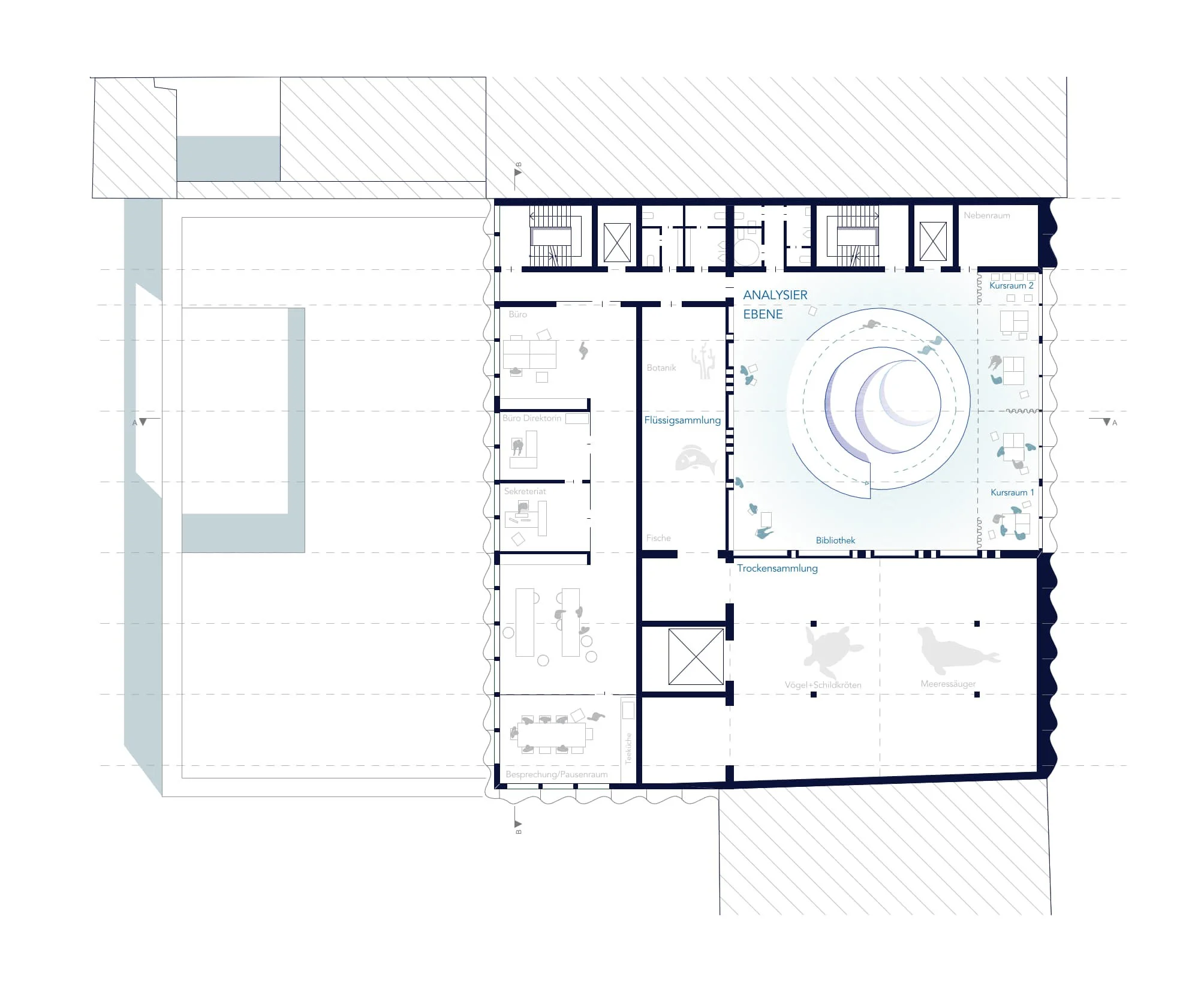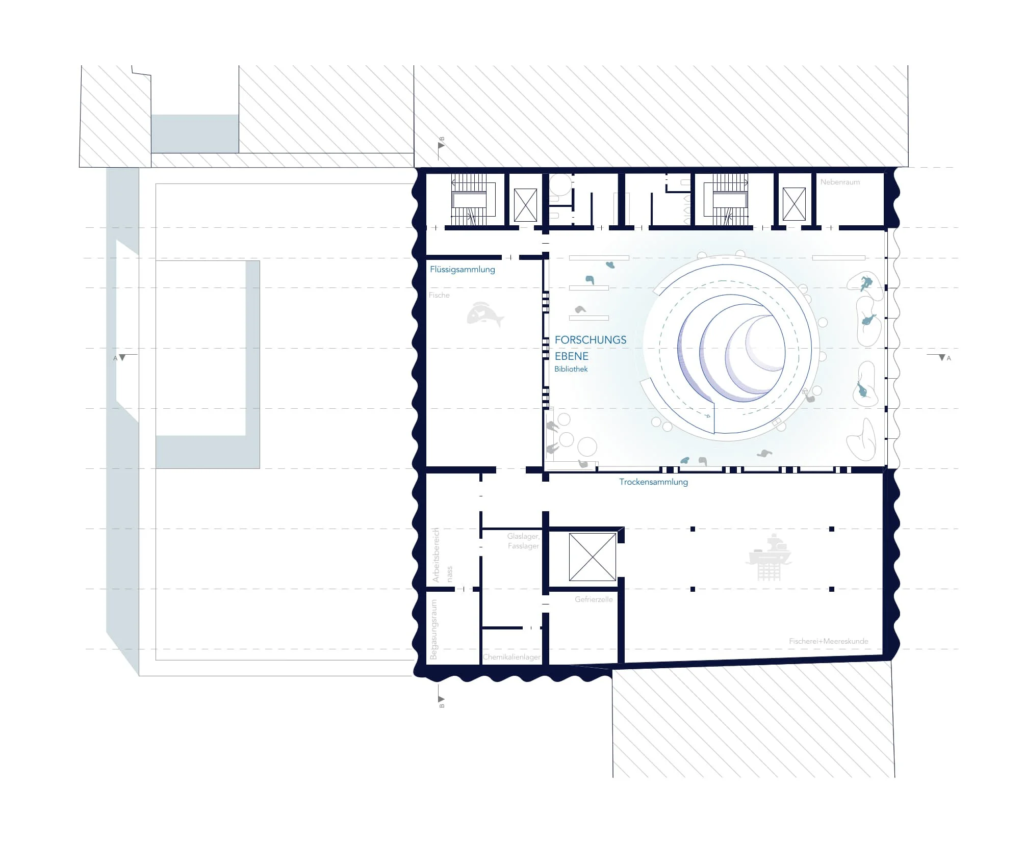 Im Erdgeschoss sind die werkstattbezogenen Nutzungen sowie die Tierhaltung verortet. Diese Ebene bildet die funktionale Basis des Forschungsbetriebs. In den Obergeschossen befinden sich die Administration und die Sammlung. Der Zugang zu den Forschungsbereichen ist ausschließlich den Mitarbeitenden vorbehalten. Besucherinnen und Besucher erhalten jedoch kontrollierte und gezielte Einblicke in ausgewählte Teile der Sammlung, wodurch Forschung sichtbar gemacht wird, ohne Arbeitsabläufe zu stören.