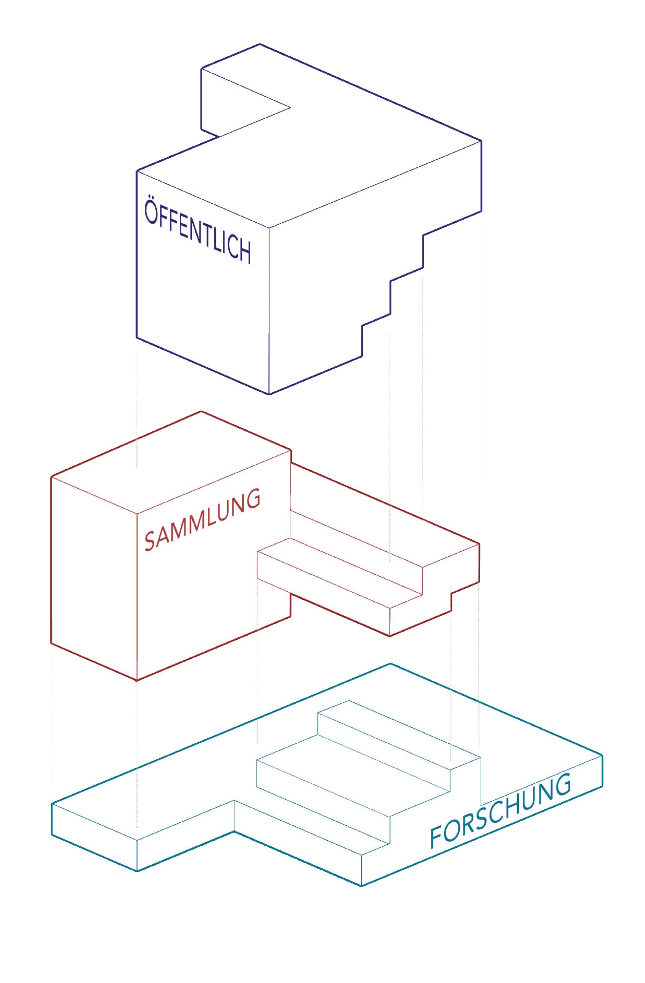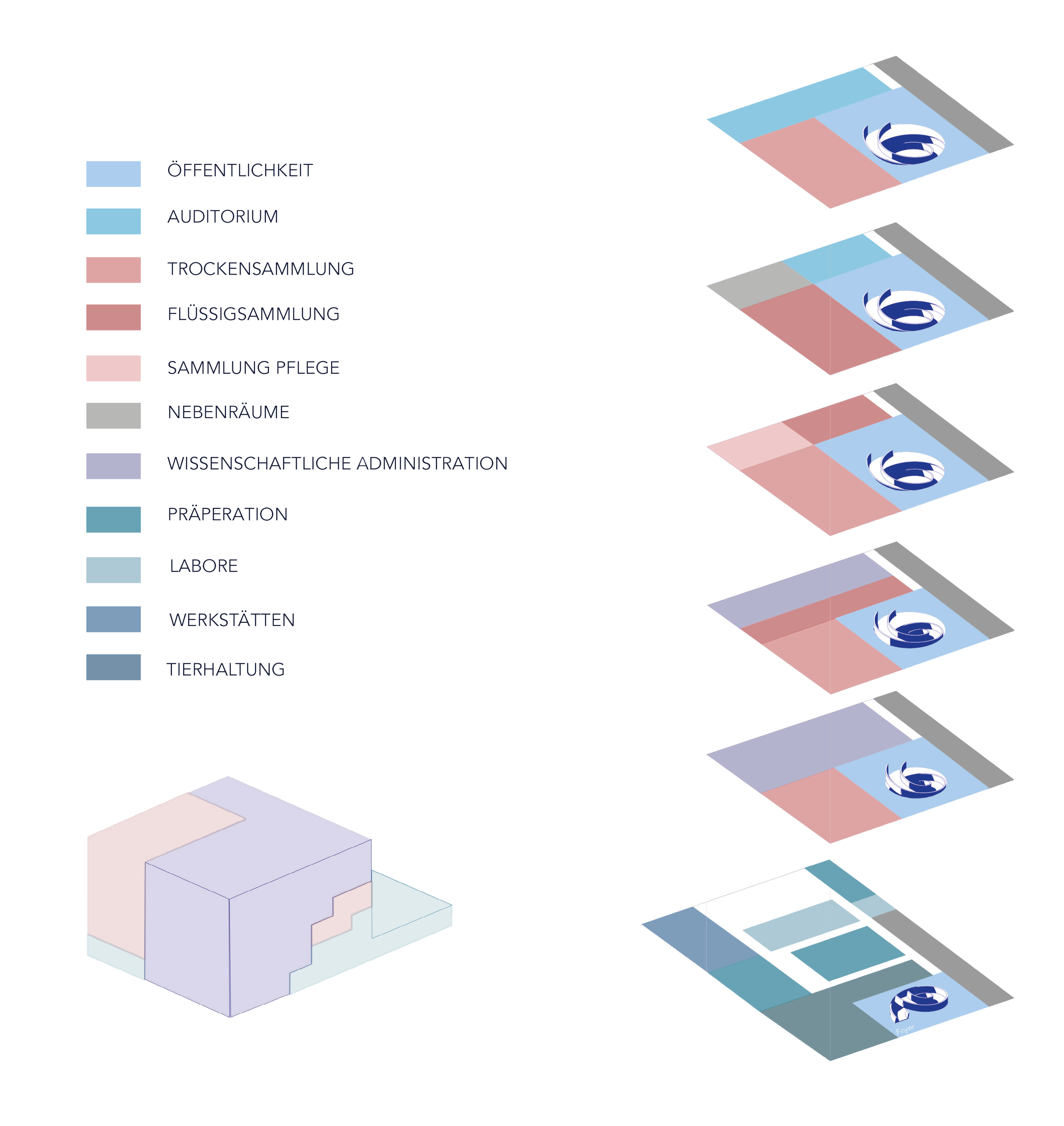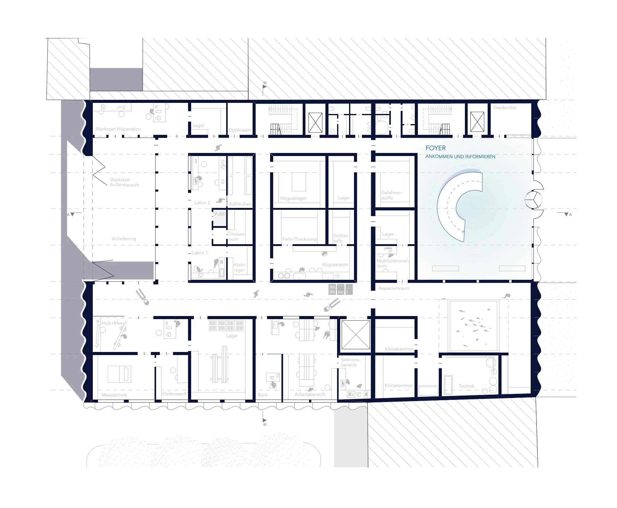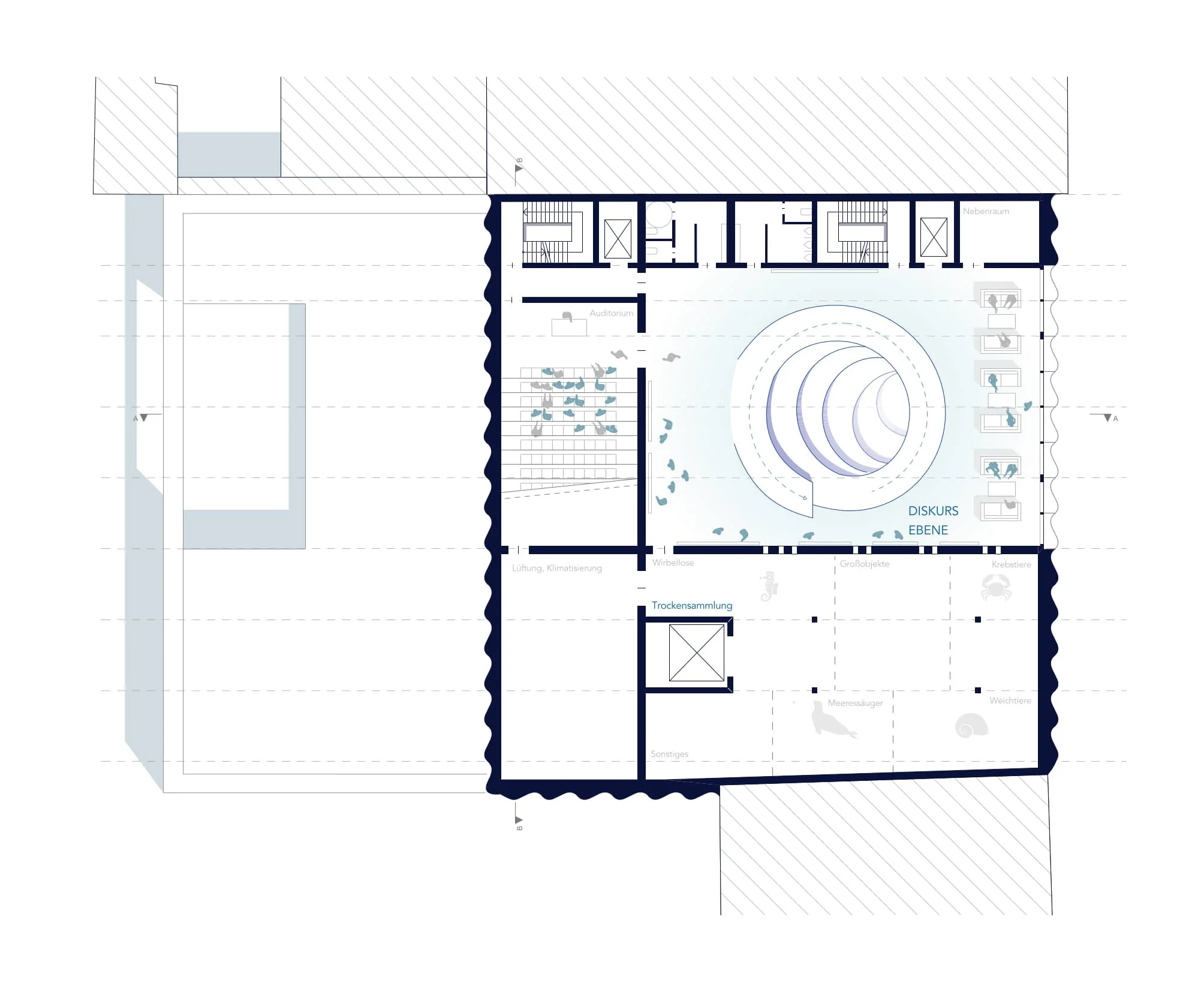 Im Erdgeschoss sind die werkstattbezogenen Nutzungen sowie die Tierhaltung verortet. Diese Ebene bildet die funktionale Basis des Forschungsbetriebs. In den Obergeschossen befinden sich die Administration und die Sammlung. Der Zugang zu den Forschungsbereichen ist ausschließlich den Mitarbeitenden vorbehalten. Besucherinnen und Besucher erhalten jedoch kontrollierte und gezielte Einblicke in ausgewählte Teile der Sammlung, wodurch Forschung sichtbar gemacht wird, ohne Arbeitsabläufe zu stören.
