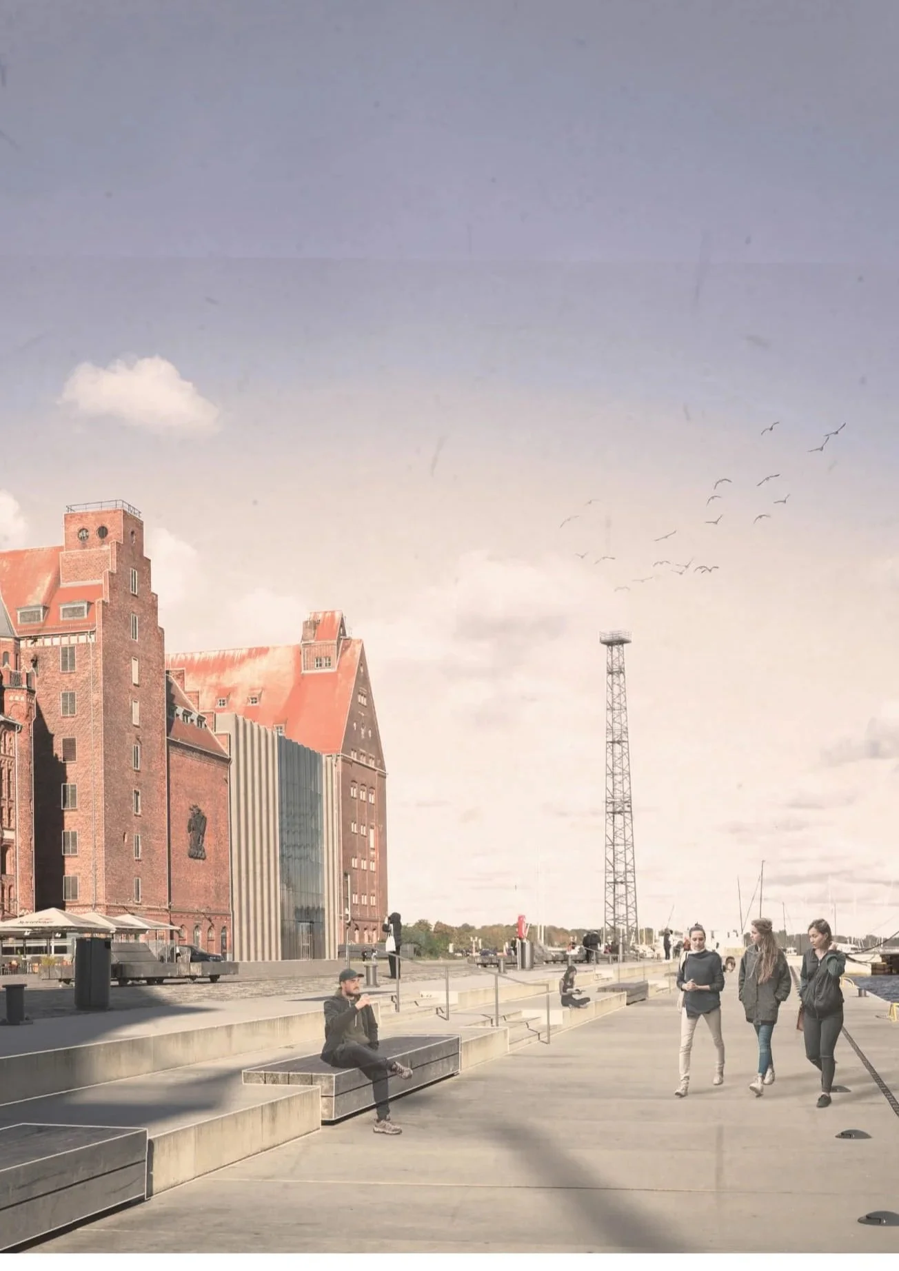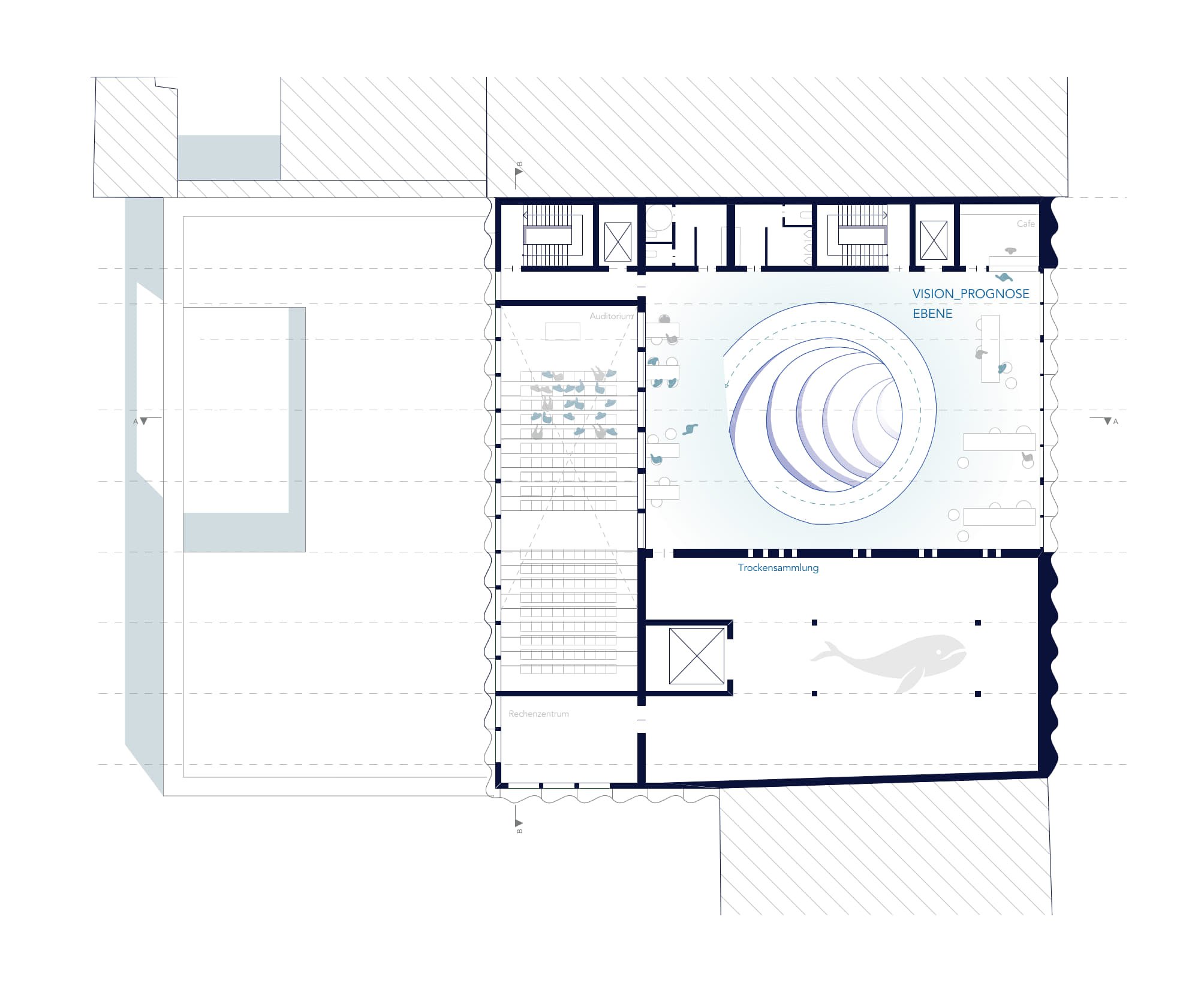 Das oberste Geschoss widmet sich der Auseinandersetzung mit Visionen und Prognosen. Hier öffnet sich der Strudel räumlich und visuell. Großzügige Blickbeziehungen zur Stadt und zum Hafen ermöglichen eine ungestörte Wahrnehmung des Umfelds und unterstreichen den Ausblick in zukünftige Entwicklungen der Meeresforschung.