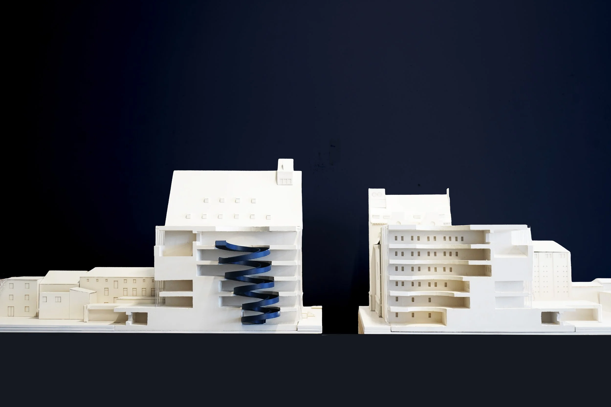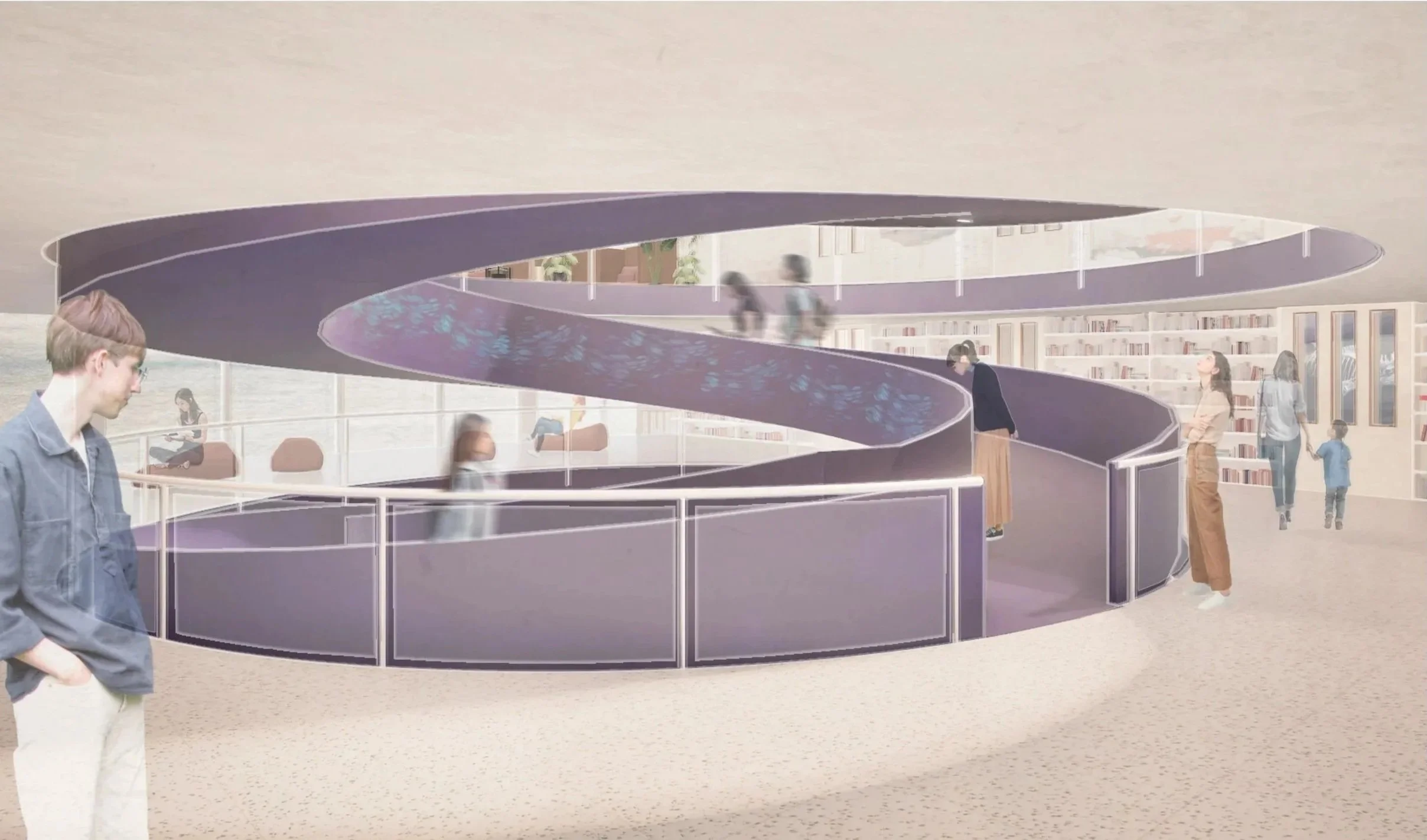 Der öffentliche Teil des Gebäudes wird durch den sogenannten „Strudel des Wissens“ geprägt. Dieser bildet das räumliche Herz des Hauses und schraubt sich als vertikaler Erschließungs- und Aufenthaltsraum in das Gebäudeinnere. Mit zunehmender Höhe öffnet sich der Strudel stärker und erzeugt im obersten Geschoss einen großzügigen Raum des Austauschs und der Begegnung.